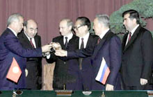 Chinese President Jiang Zemin, Russian President Vladimir Putin, Kazakh President Nursultan Nazarbayev, Kyrgyz President Askar Akayev, Tajik President Emomali Rakhmonov and Uzbek President Islam Karimov signed the declaration of the SCO.