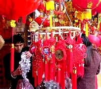 In Shanghai, China's most important commercial hub, Shopping malls are decorated in a Chinese way. People could easily buy red lanterns, red firecrackers and the red Chinese character "fu", which means good luck, in streets.