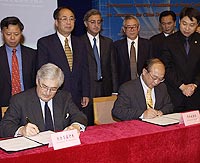 The Signing Ceremony of the Memorandum of Understanding on China?s Joining the Development Gateway Foundation & Press Conference for Launching the China Development Gateway was held at the Press Hall of the State Council Information Office on May 28. Present at the signing ceremony and press conference were President of the World Bank James D. Wolfensohn, Chinese Minister of Finance Xiang Huaicheng, and Minister of the State Council Information Office Zhao Qizheng.
