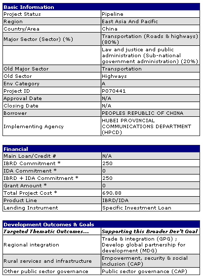 The World Bank's Board of Executive Directors approved a US$250 million loan for the China Hubei Xiaogan-Xiangfan Highway Project on September 17. The project will provide for a more effective, safe, and efficiently managed highway system, which will help to support social and economic development as well as trade in Hubei Province. It will also improve transportation links to China's Western region.