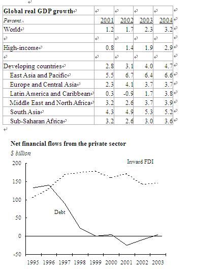 Net debt flows were very weak especially to Latin America, and foreign direct investment, while more resilient than debt, was nonetheless US$29 billion lower in 2002 than in 2001. The price of oil jumped from US$19 to US$28 per barrel over the course of 2002. For oil importers, this rise more than offset gains in agricultural and metals prices. The baseline forecast projects growth in developing countries to accelerate to 4 percent in 2003 and to 4.7 percent in 2004.
