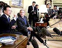 On the nuclear issue on the Korean Peninsula, Bush said the two countries share a mutual goal, and "that is for the Korean Peninsula to be nuclear-weapons free."