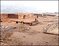 At the end of 2002, only one pit was made, measuring five meters in both length and width. Digging one meter deep, a building base appeared and further work brought to light a house site which was three rooms wide and two rooms deep. Traces show there were other buildings nearby. Further excavation led to two house sites at the east-west trend, where there were wing-houses on both sides of the former north-south house. While cleaning up the wing house ruins, archaeologists again found a new larger house base, sitting to the south of the first unearthed building base.