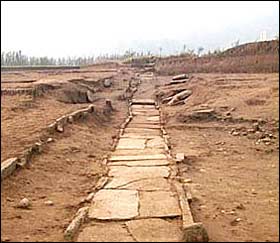 The pebbled road in the south of the square soon disappeared, but a north-south stone plank road emerged, which led to the Pengxi River. Almost all the roads unearthed in Mingyueba came to the Pengxi River at last. Sailing upwards, the Tang people could get to Kaizhou, a significant town of Xiachuandong and now called Kaixian. Going downwards, people would go to the Yangtze River at Shuangjiang (Two Rivers) Town. In this way, Mingyueba was connected with Yizhou (today's Chengdu, capital city of Sichuan Province), the political and economic center of the upper reach of the Yangtze River, and Yangzhou, Jiangsu Province, the political and economic center of the lower reach of the Yangtze River.