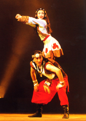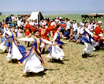 The horse is essential to nomadic tribes in Inner Mongolia. Since horses are intuitive of human feeling and can know the way through boundless prairies and help their owners out of trouble during war, they are loyal friends to nomadic tribes. Consequently, horse images are frequently found in folk dances on the pasture lands. Herdsmen do not simply imitate the appearance of a horse. They put deep feeling into portraying horse characteristics. By arm, shoulder and body movements, they reveal the valiant and heroic bearing of horse riders and various horse images.
