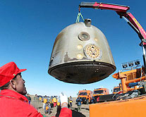 The re-entry vehicle of Shenzhou V was taken to Beijing Friday afternoon after the successful landing in central Inner Mongolia Autonomous Region, north China.