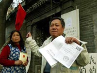 Huang Zhenyun stands in front of his house holding his property ownership certificate. His wife holds a copy of the newly amended Constitution.