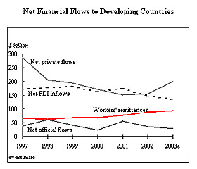A significant and growing new source of capital for developing countries is remittances sent home by migrants working in rich countries, which have climbed steadily since 1998, reaching US$93 billion in 2003, up 20 percent from 2001. They are now the second most important financial flow to developing countries after FDI, and represent almost double the flows of official aid.