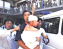 The injured were taken to the No. 1 Hospital Affiliated with Peking University. Most of the young victims have head and neck wounds, doctors said. The most seriously wounded were attended to first, with doctors unable to comment, saying they were too busy to tending to the wounded. Thirteen of the 15 young victims are children of hospital staffers.