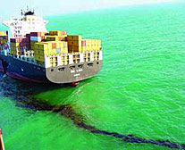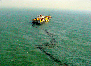 Officials say that there is little likelihood that the oil will significantly damage the shoreline, as a brisk northeasterly wind is expected to blow it out to sea.