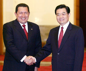 President Hu Jintao said China would like to join hands with Venezuela to bring their strategic partnership to a higher level. He was speaking on Thursday while meeting the visiting Venezuelan president, Hugo Rafael Chavez Frias, in Beijing.