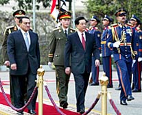 Prior to the formal talks, Hu and Mubarak met briefly. The Egyptian president first extended his warm welcome to Hu.