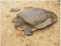 Although the turtles spawn twice a year, normally in July and September, with 20 to 30 eggs at one time, their survival rate is very low because of flooding, otters, livestock and human interference.