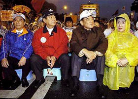 Lien Chan and James Soong, leaders of the Kuomintang and People First Party coalition, joined their supporters in the ongoing sit-in near the “presidential palace” in Taipei on March 25, 2004. The demonstration has continued for more than 100 hours so far.
