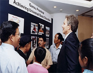 in July 2003 Kang and three other girls who had won Gansu Basic Education Project (GBEP) scholarships were invited to meet British Prime Minister Tony Blair and his wife Cherie in Beijing.