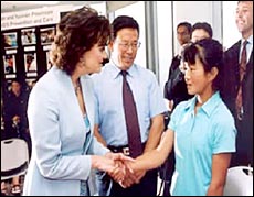 The normally retiring Kang spoke up on this special occasion to say, "Nice to meet you," in English to Blair.
