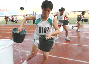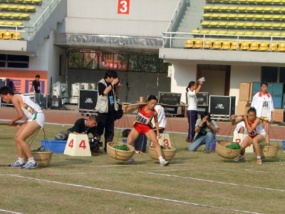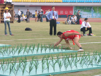 The 60-meter seedling transplanting also went down well. According to the rules, athletes begin carrying two empty baskets on the shoulder pole. They have to put 300 plastic seedlings into the baskets half way along before running to the transplanting area to “plant” them into 300 holes on a soft wooden block. Spectators couldn’t help laughing as they saw athletes drop seedlings everywhere or unable to fill holes. Upon completion of the game, event staff and reporters tried the event for themselves, causing more laughter from the crowds.