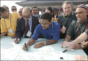 Before the final meeting, the delegates adjourned to the Altar of Prayer for Good Harvests at the Temple of Heaven Park, a UN World Heritage site. They were welcomed by hundreds of middle-school children waving flowers, accompanied by Chinese folk music. A huge length of green silk had been draped over a long ceremonial signing table in front of the altar.