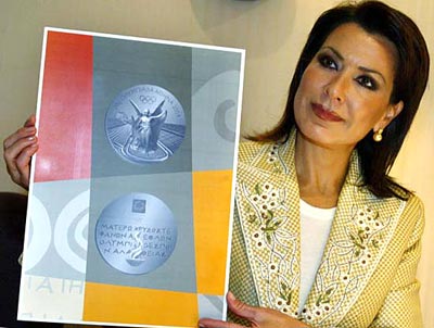 Mrs. Gianna Angelopoulos-Daskalaki, President Organizing Committee for the Olympic Games Athens 2004, is showing medal pictures to media.