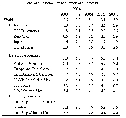 This comparatively buoyant growth among developing countries is led by East Asia, South Asia, and Eastern Europe and Central Asia, where regional GDP grew respectively by 8.3, 6.6 and 6.8 percent in 2004.