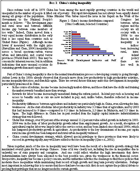The favorable macroeconomic outlook, on the back of an impressive growth record, allows policymakers to broaden policy objectives. As outlined by Premier Wen Jia Bao, in his speech to the March National People's Congress, the government's objectives are now to create a "harmonious society" and focus on the "five balances" including the balance between economic and human development, domestic and external economy, man and nature, rural and development, and interior and costal development. For 2005 the Prime Minister announced the policy priorities to be (i) the government's function and organization; (ii) SOEs and corporate governance; (iii) the financial sector; (iv) rural finance; and (v) social security.
