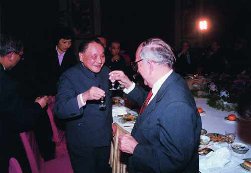 Deng Xiaoping congratulating Israel Epstein on his 70th birthday at the Great Hall of the People. (April 1985)