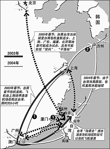 In 2004, the charter flight program was stopped because Taipei insisted on the exclusion of mainland airlines and stopovers for charter flights.