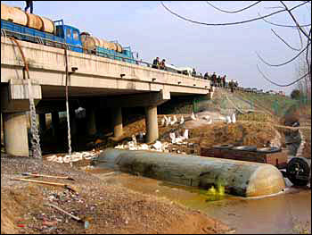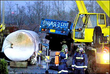 The truck carrying the chemical overturned, dumping the tanks on the road. Rescue and recovery teams have moved the tanks into a pond to prevent further spread and gasification of the chemical.