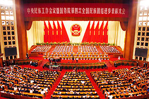 Hu called on the whole nation to have a correct understanding of the ethnic issue under the new situation, accomplish every job concerning the work of ethnic affairs, and help ethnic minorities and ethnic areas to step up economic and social progress to promote common prosperity and development of the whole nation. "It is the natural requirement for us in our efforts to build a relatively affluent society in an all-round way, quicken the pace of our socialist modernization, consolidate and develop the great unity among all ethnic groups, ensure the long-lasting stability of the Party and the country, open up a new situation for building socialism with China's own characteristics, and realize the great rejuvenation of the Chinese nation," he said. "We must fully respect and understand the differences of traditions, languages, cultures, customs and senses of national identity cultivated in the history of various ethnic groups. We should neither ignore their existence nor try to change them by force." Instead, efforts should be made to create conditions to narrow and finally close the gap between development levels of various ethnic groups though it is a long-term job. According to Hu, the ethnic issue in China is usually an expression of a combination of economic issues with political ones, of present-day problems with historical ones, of ethnic issues with religious ones, and of domestic issues with international ones. Thus to handle the ethnic issue correctly has a bearing on the economic, politic and cultural fields as well as the building of a harmonious society, he said. To realize the common prosperity of all ethnic groups is one of the major goals for China's current efforts to build a moderately well-off society in an all-round way, Hu stressed. He quoted official figures as saying that in 2004, the per-capita gross domestic product (GDP) in ethnic autonomous areas was only 67.4% of the national average, while the per-capita net income of farmers there was merely 71.4 percent of the national average. The Party and government will adopt more efficient policies and measures to step up economic and social development of ethnic minorities and ethnic areas, narrow the gap between development levels gradually, realize the coordinated development among different regions, and finally reach the goal of common prosperity of all ethnic groups in the country, he said. The leadership of the Party and the socialist system of the country have laid a fundamental political foundation for the great unity of all ethnic groups, which is an important guarantee for us to stand the test of various difficulties and risks and win victory after victory in the past, at present and in the future, the president stressed. He noted that after the Cold War, ethnic separatist forces, religious fundamentalist forces and violent terrorist forces have been quite active in the neighboring areas of China. They are trying every means to infiltrate and sabotage the country. "Under such complicated situation, we must unswervingly carry out Party's policy toward nationalities and make vigorous efforts to do the work of ethnic affairs well," said Hu. He pledged to adhere to and implement the basic theories and policies on ethnic issues developed by the three generations of Party leaders, consolidate and push forward the equal, united, mutually-supportive and harmonious relations among all ethnic groups, adhere to and improve the system of regional ethnic autonomy, respect the religious belief of ethnic minorities, and resolve the ethnic issue in a fundamental way by helping ethnic minorities and ethnic areas to accelerate economic and social development. While safeguarding the dignity of law and the interests of all ethnic groups, the government will crack down on ethnic separatist forces and their activities, firmly oppose the hostile forces outside China making use of the ethnic issue for acts of infiltration and sabotage, He stressed. The president said that to support ethnic minorities and ethnic areas to accelerate development is a basic policy of the central authorities and a major task for pushing forward the development of the western region. He called for great efforts to help develop education, science and technology, culture, and public health, and give priority to accomplishing the work of poverty eradication and development in ethnic areas. More talented professionals from ethnic minorities will be trained and more ethnic officials be promoted, Hu said. He also called for intensified efforts to strengthen the unity of all ethnic groups and safeguard the unity of the whole nation, stressing that the reunification of the motherland is the supreme interest of all ethnic groups and the unity of all ethnic groups is a major guarantee for the reunification of the motherland. He urged Party organizations at all levels to strengthen and improve the Party's leadership in the work of ethnic affairs, saying the leadership of the Party is the fundamental assurance for accomplishing the work.