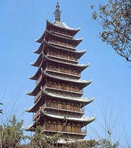 The nine-storeyed Square Pagoda, its body built of brick and pent roofs of wood, is more than sixty meters high, one of the highest ancient pagodas in China. The ground storey is octagonal inside and has doors opening in four directions. Between the ground and second storeys there is a built-in floor that connects with the ground floor through an air space. The interior of the other storeys from the second level up is square, and has wooden staircases to reach upper levels. Each storey has doors facing in four directions, and each door is flanked by false lattice windows, like a three-room compartment. As each storey has projecting balconies surrounded by balustrades, people may go out in the open and enjoy the landscape around the pagoda. The inner space from the first to the fifth floor is the same, but from the sixth level up, the body of the pagoda shrinks drastically, making the whole structure of the pagoda look like a vertically erected shuttle, lofty and elegant. This kind of design is not often seen among pagodas in southern China. A huge iron spike, planted right in the middle of the sixth storey and running through the seventh, eighth and ninth storeys, points to the sky. The pagoda's steeple, also made of iron, is composed of a string of gourds covered by a square canopy. Four iron chains link the four corners of the canopy with the four corners of the pagoda roof. The steeple, more than ten meters high, harmonizes with the main body of the pagoda and makes it look more magnificent.
