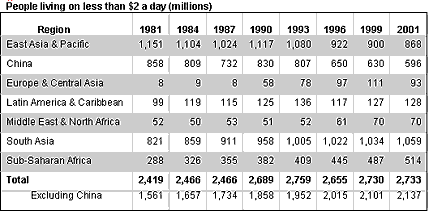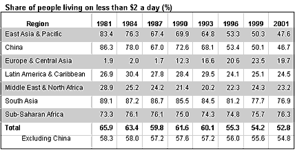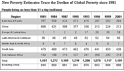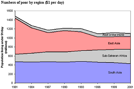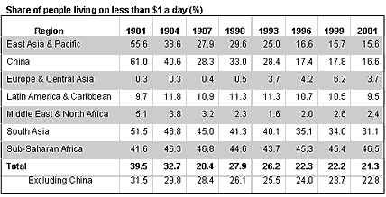 The proportion of people living in extreme poverty (less than $1 a day) in developing countries dropped by almost half between 1981 and 2001, from 40 to 21 percent of global population, according to figures released today by the World Bank. But while rapid economic growth in East and South Asia has pulled over 500 million people out of poverty in those two regions alone, the proportion of poor has grown, or fallen only slightly, in many countries in Africa, Latin America and Eastern Europe and Central Asia.