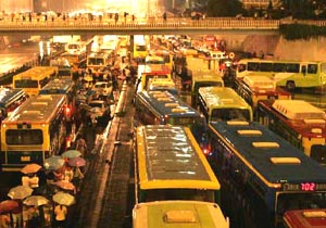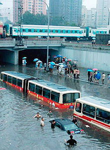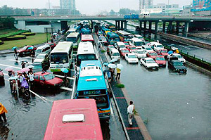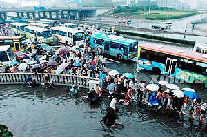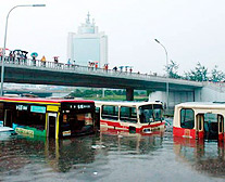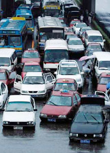 Many cars were nearly submerged and trapped in the water causing serious traffic jams at crossroads, said witnesses.