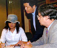 Seated in a wheelchair, Zhao, 37, wore a hat and sunglasses to cover bumps and bruises on her forehead for fears that her family back in China would be upset if they watched TV footage of the joint interview. But a long bruise remained clearly visible on her left chin.