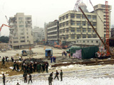 Two hoisting machines swayed huge iron balls to hit the fragmentary construction. However, it may take several days to totally demolish the structure as faster methods, like controlled implosion, may have negative effects on the prevention of surface subsidence in the area, officials said.