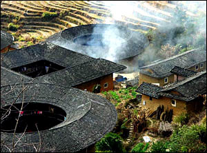 The rings of round houses, built around the same central point, spread like ripples through the green mountain regions of East and South China. An ancestral hall was located in the centre of a round house and was regarded as a holy place in the building.