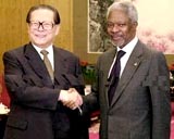 In a meeting with visiting Secretary-General Kofi Annan of the UN, Jiang said that "China attaches importance to the role of the UN and supports the organization to perform its functions in accordance with the purposes and principles of the UN Charter."