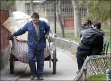 A couple cuddle on a park bench in Beijing, oblivious of a worker pulling a cart past them. A survey shows more than 50 percent of Chinese men over 40 suffer from varying degrees of impotence.