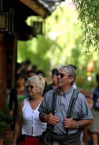 The file photo taken on April 16, 2004 shows two foreigners touring the ancient city of Lijiang in southwest China's Yunnan Province.