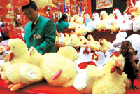 Thus, temple fairs, markets and even modern shopping malls are filled with traditional paper-cut designs, popular new year pictures, red lanterns and lucky Chinese knots. Fluffy rooster toys are also clad in Chinese-style costumes.