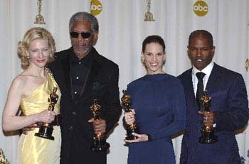 From L to R: Supporting actress Oscar Cate Blanchett, best supporting actor Freeman, best actress Oscar Hilary Swank and best actor Oscar Jamie Foxx.