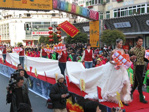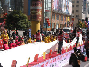 A model displayed a wedding costume with a 50-meter train held by 12 children on a 100-meter T-stage at Nanjing's Hunan Road March 3. The train is the longest in the world and the dressmaker has applied for Guinness World Record status in Shanghai.