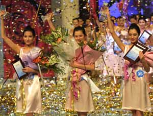 Winners of the Chinese Elegance Model Contest wave to the audience at the Beijing Hotel in the Chinese capital March 31, 2005. The event was hosted by the Chinese Designer's Association.