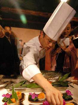 An activity called "Tang Style Fish Feast: Exhibition of Chinese Style Sashimi Culture" was held recently on a yacht cruising the Pearl River, southern China.