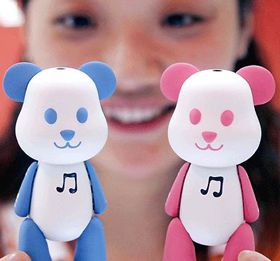 A sales girl in Beijing displays a pair of bear-shaped MP3 players on Thursday. Trendy-looking digital products are becoming popular with consumers.
