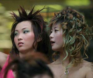Models present hairstyle creations during a hairstyle competition in Nanjing, capital of east China's Jiangsu Province on May 28, 2005.