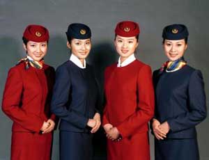 Air China stewardesses in new uniforms pose for the camera with designer Oliver Lapidus, from France, in a press conference in Beijing on December 26, 2002.