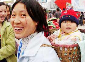 A woman from southwest China's Chongqing Municipality, waits with her baby at the Railway Station of Fuzhou, capital of southeast China's Fujian Province, Jan. 7, 2004.