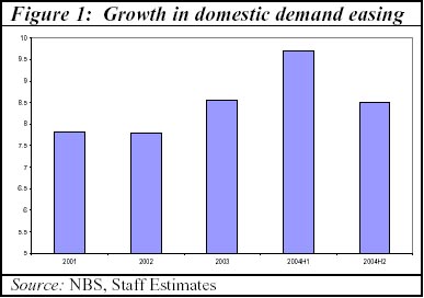 China's economy finished the year 2004 on a strong note, with a gain of 9.5 percent in GDP against 9.3 percent in 2003. This unexpectedly high outturn was driven by strong export performance in the second half of the year, whereas domestic demand has been easing in 2004, led by a slowdown in investment. Growth in domestic demand declined from almost 11 percent in the first half of the year to a more sustainable 8.5 percent in the second half (Figure 1).