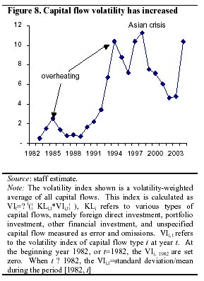 The balance of payment surplus and concomitant reserve buildup accelerated through 2004, even as capital inflows diminished. Net capital inflows (including "errors and omissions") reached US$60 bn., or 8.4 percent of GDP, in the first half of 2004. These flows consisted of US$ 30 bn. in FDI, US$ 19 bn. reallocation of foreign exchange assets, and US$ 5.5 bn. from overseas IPOs. Foreign exchange reserve reached US$610 billion by end-2004, having increased by a full US$95 billion in the fourth quarter, apparently driven by the rising trade surplus rather than capital flows. Capital inflows, while they remained strong in 2004, are estimated to have declined through the year, from US$49 billion in the first quarter of 2004 to 26 billion in the fourth.4 At the same time, the volatility of the flows has been increasing in 2004 (Figure8), which complicates the authorities' efforts to sterilize the reserve built-up-- even though the overall volume of sterilization remains manageable for now (see below).