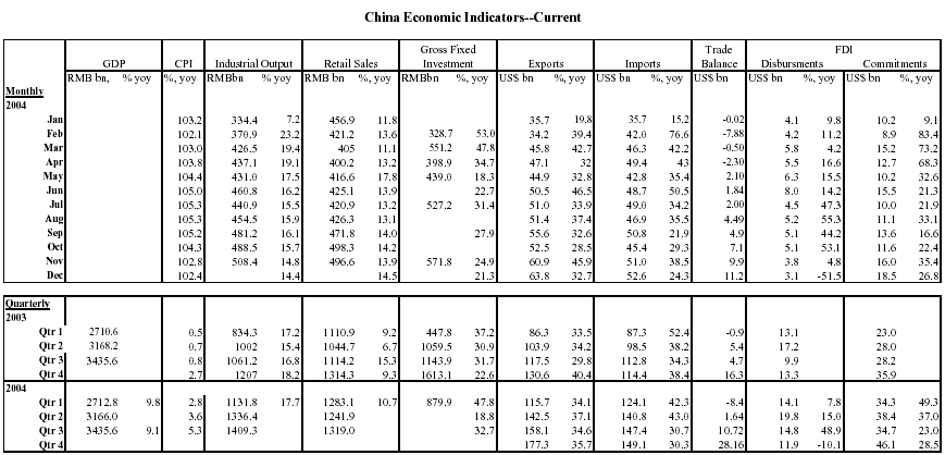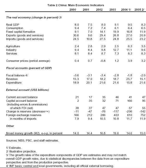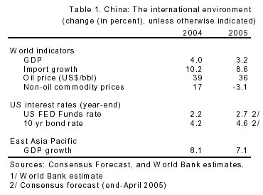 The macroeconomic outlook for 2005 remains favorable, with a supportive external environment, prospects of robust domestic demand growth, and waning underlying inflation pressures. In these circumstances, policymakers are rightly putting emphasis on institutional and structural reforms. The December Central Economic Work Conference formulated directions on macroeconomic management, public finances, and institutional and structural reforms. The announced switch from a "proactive" to a "prudent" monetary policy stance likely reflects the authorities' willingness to increase interest rates if warranted. Announced further interest rate reforms could improve rural finance and resource allocation. The fiscal deficit target for 2005 remains largely unchanged from last year's outcome, whereas the announced increase in government spending on public goods and services, especially in poor rural regions, could improve equity and increase consumption. Several worthy tax reforms are under consideration, including unification of enterprise income tax regimes and a fuel tax. To reduce the tendency of over?investment and improve the use of land, urban finance, the intergovernmental fiscal system, and the performance monitoring system for local governments are in need of reform.